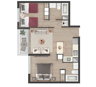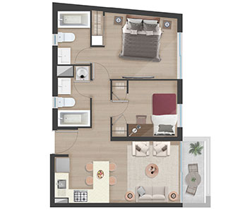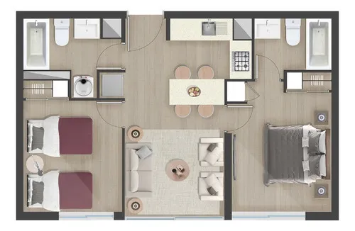 Características y terminaciones: piso gres porcelánico en hall, cocina, living comedor, dormitorios, baños y pasillos. Muros cerámicos (húmedos) en baños. Cocina americana equipada con encimera eléctrica, horno, campana y muebles con cubierta de cuarzo. Instalación para lavadora. Agua caliente individual con termo eléctrico.