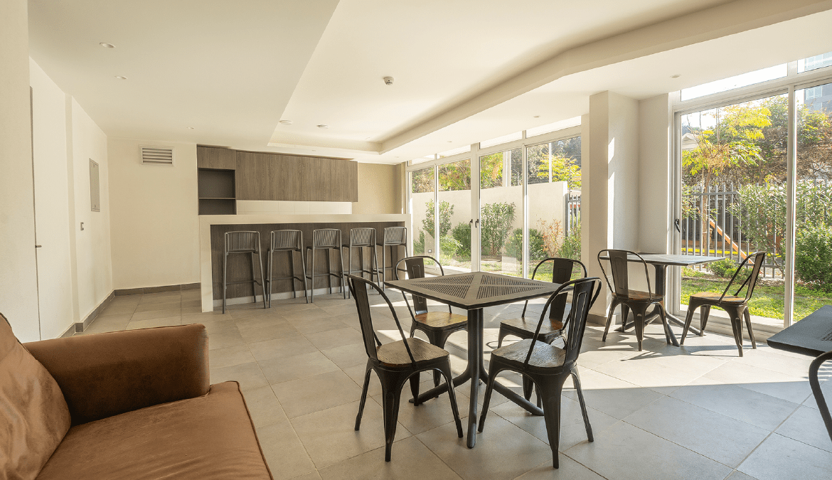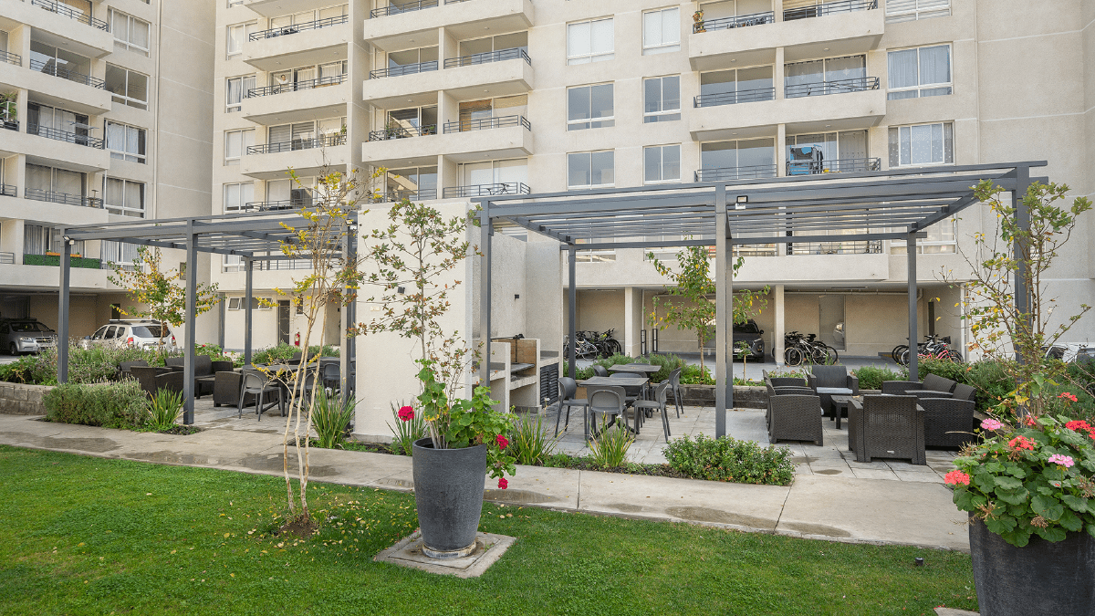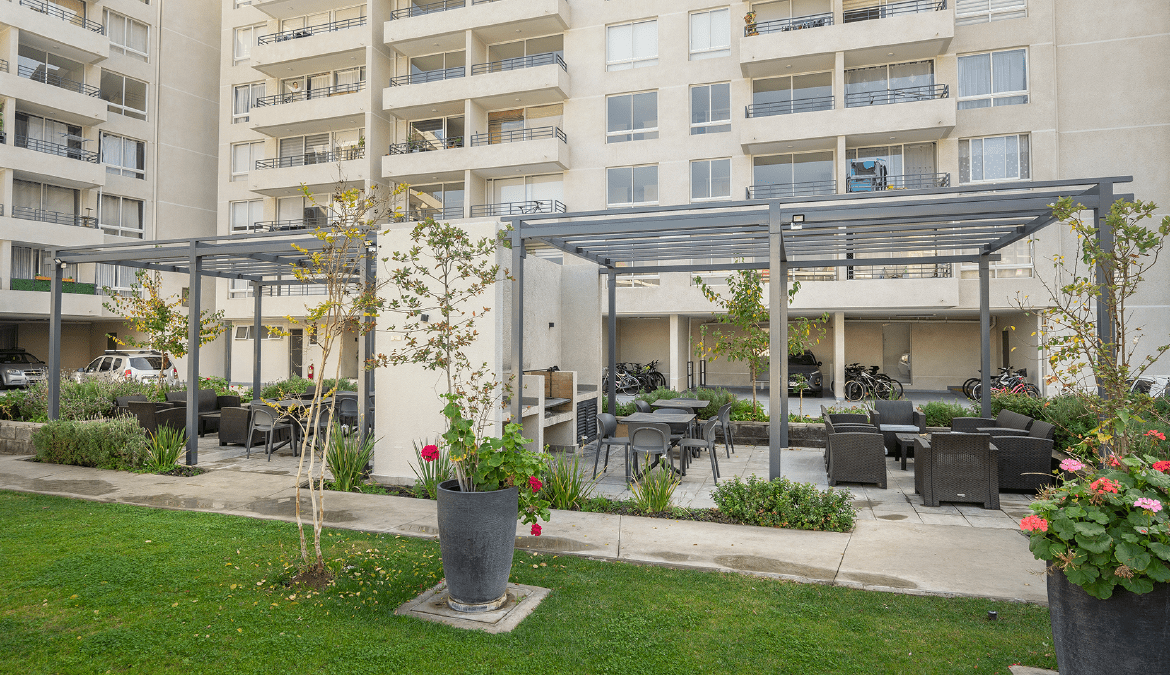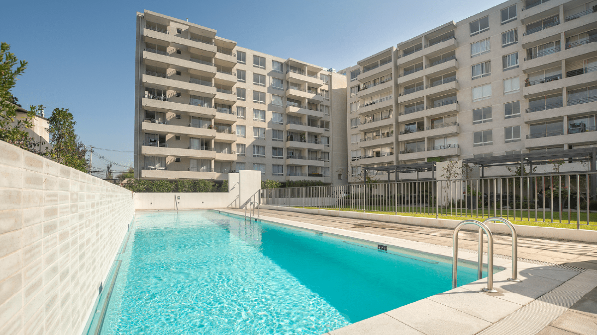 Equipamiento comunitario: hall de acceso equipado, piscina, salas de uso múltiple, áreas verdes interiores, 2 quinchos, bicicleteros y estacionamiento de visitas.