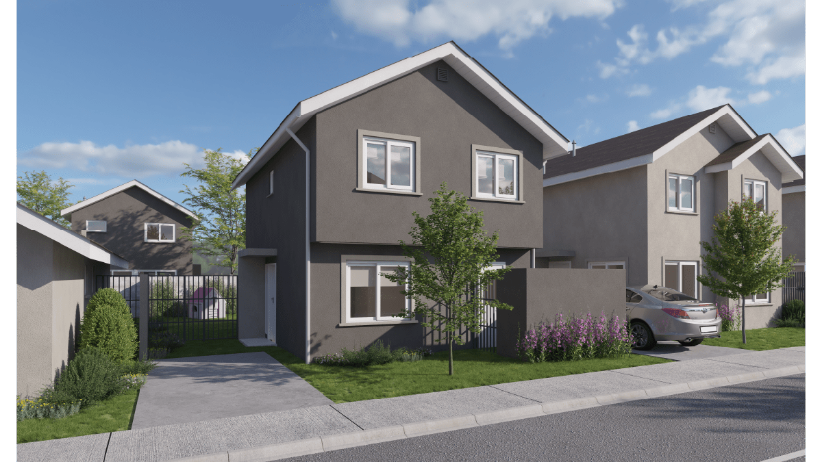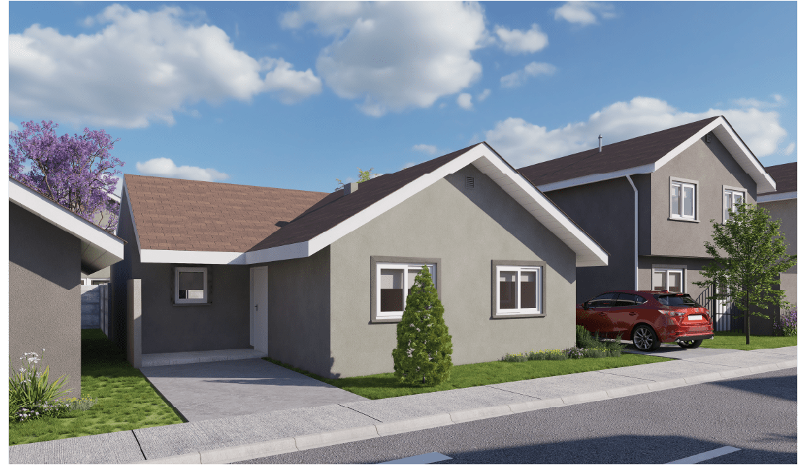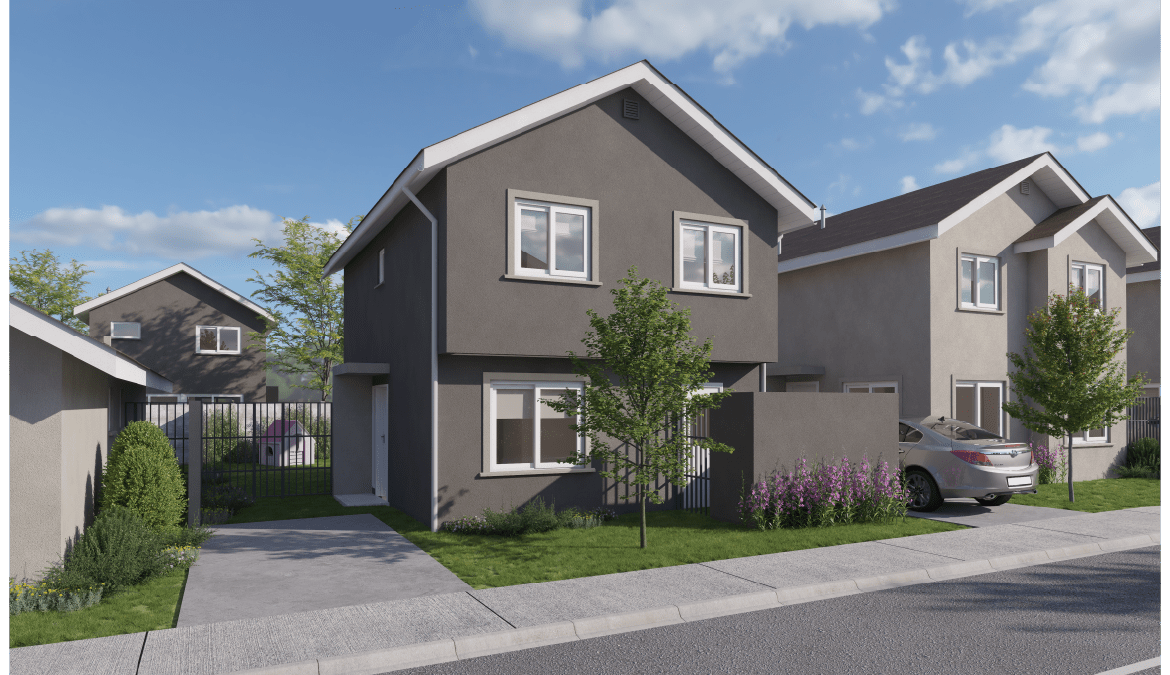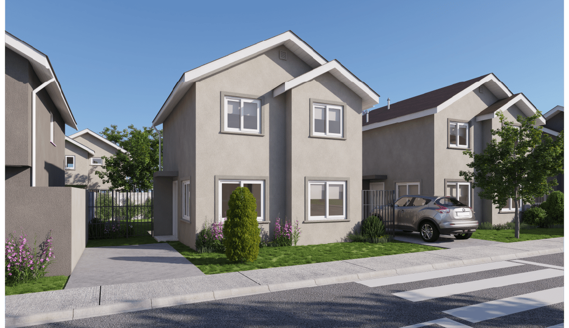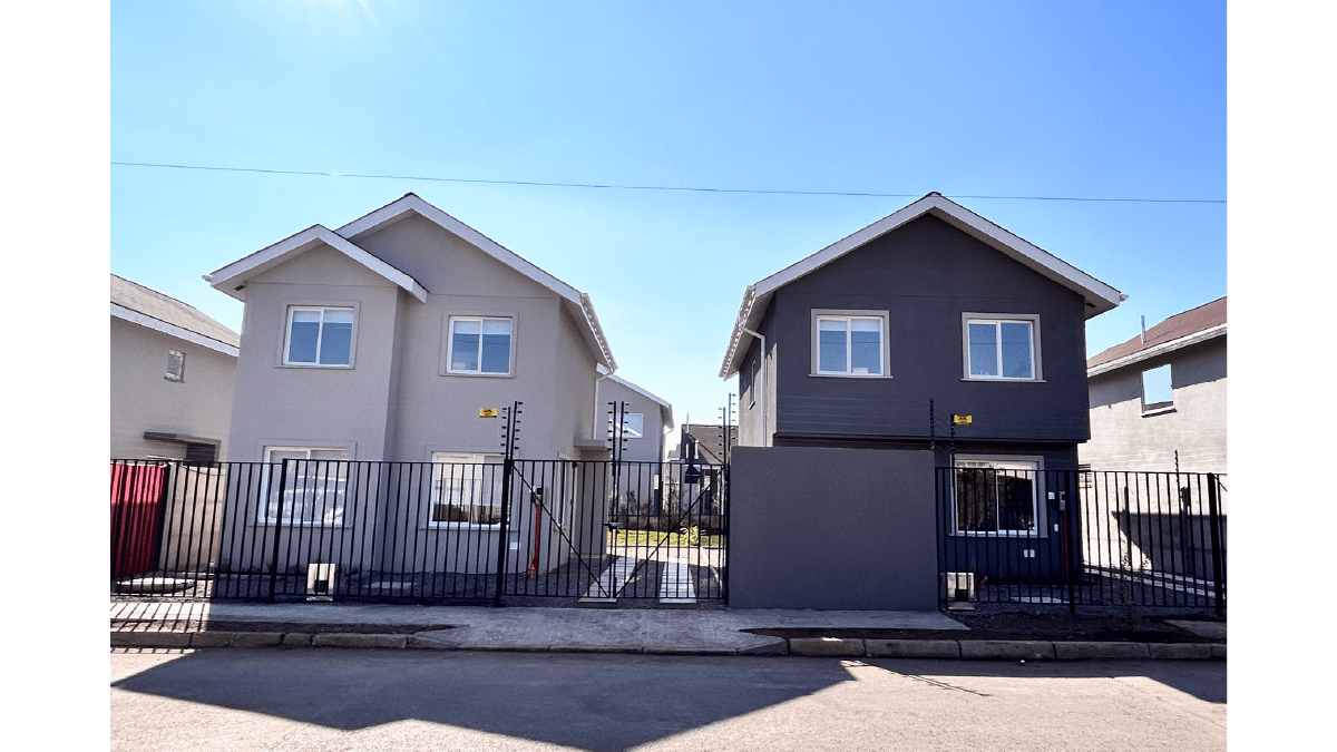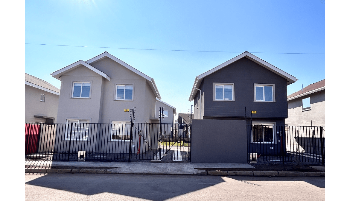 Características y terminaciones: casas sólidas primer y segundo piso, cocina amoblada con horno, campana y encimera. Ventanas de aluminio color titanio, vidrio simple.