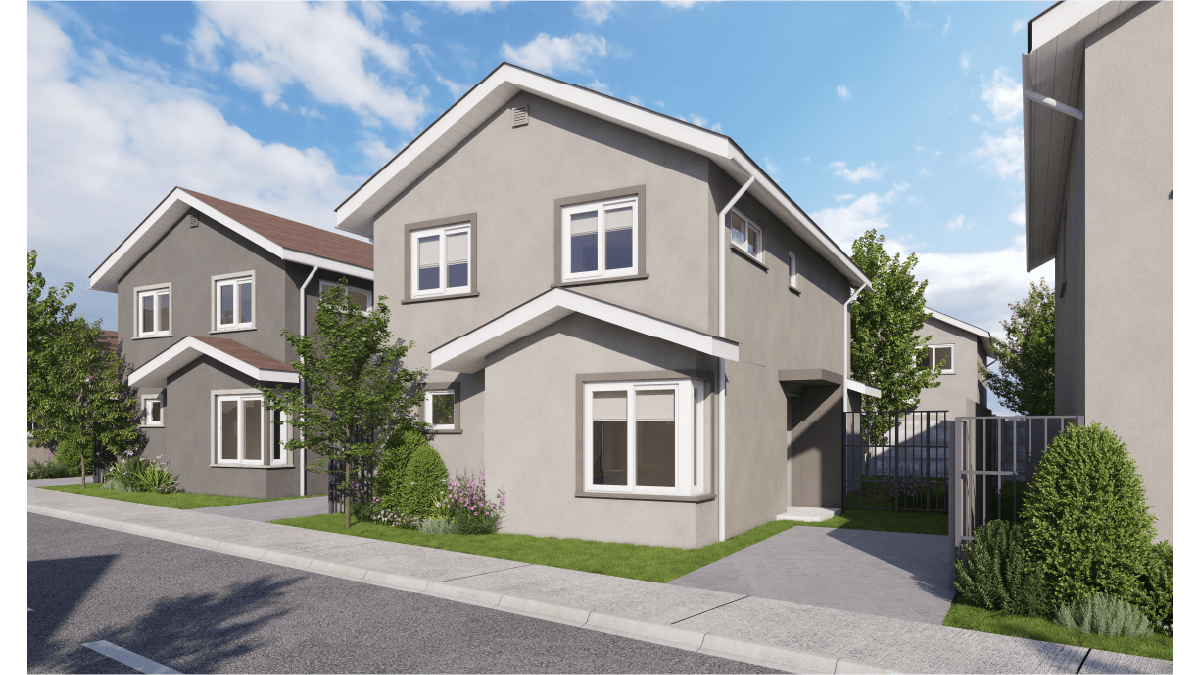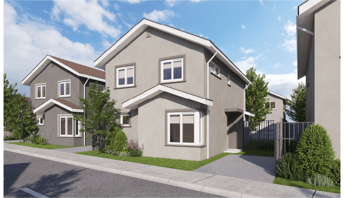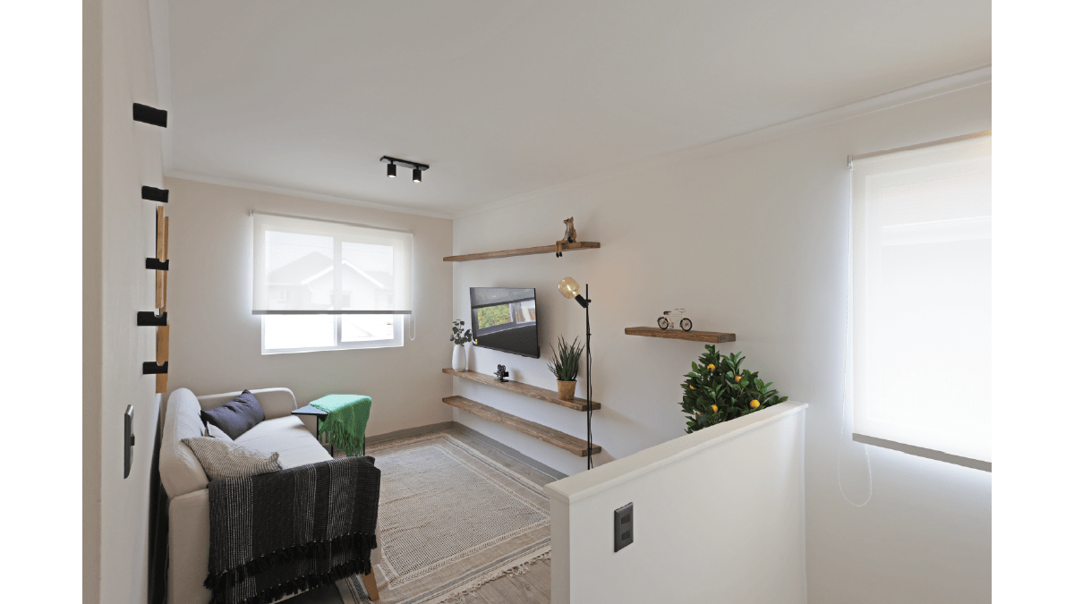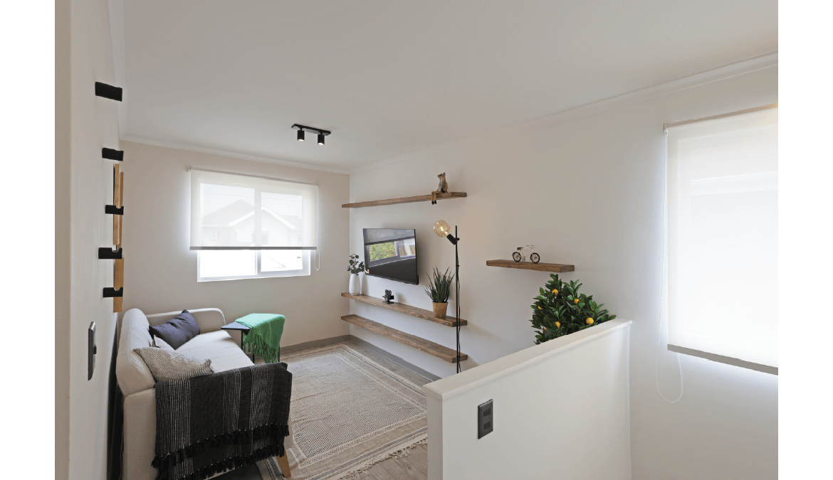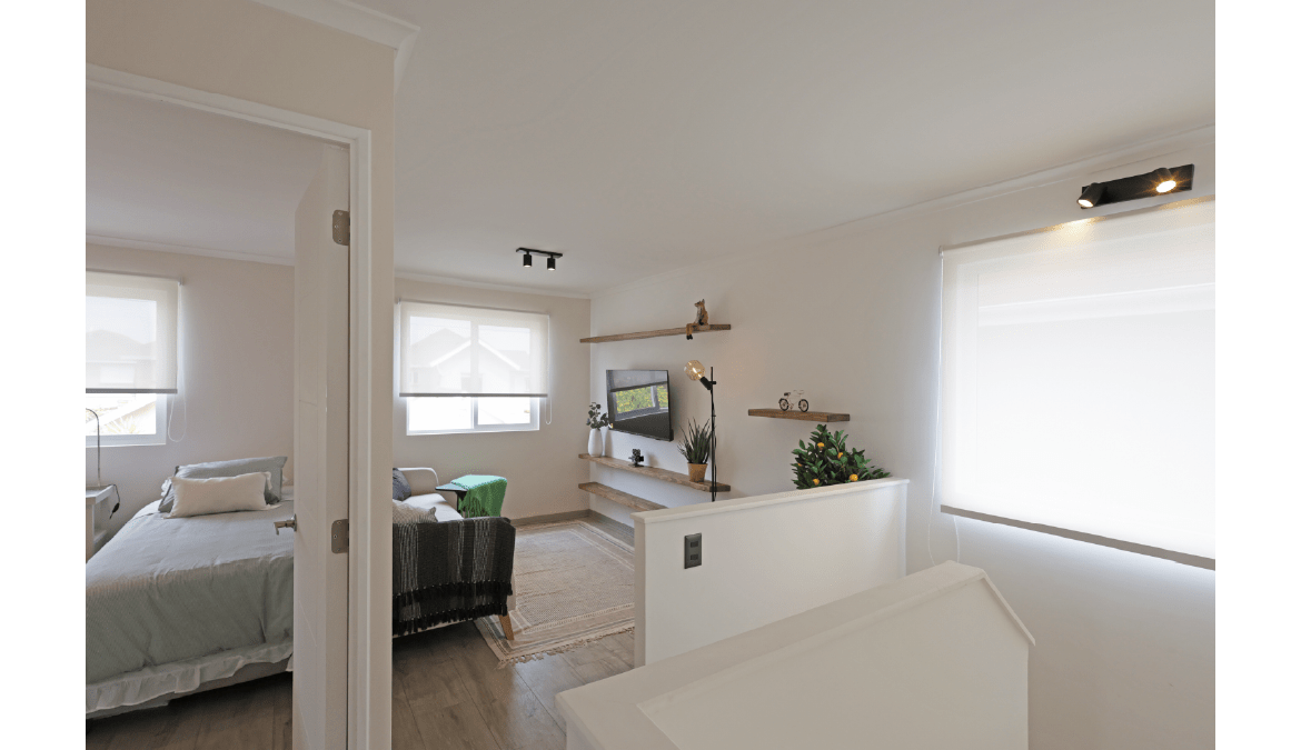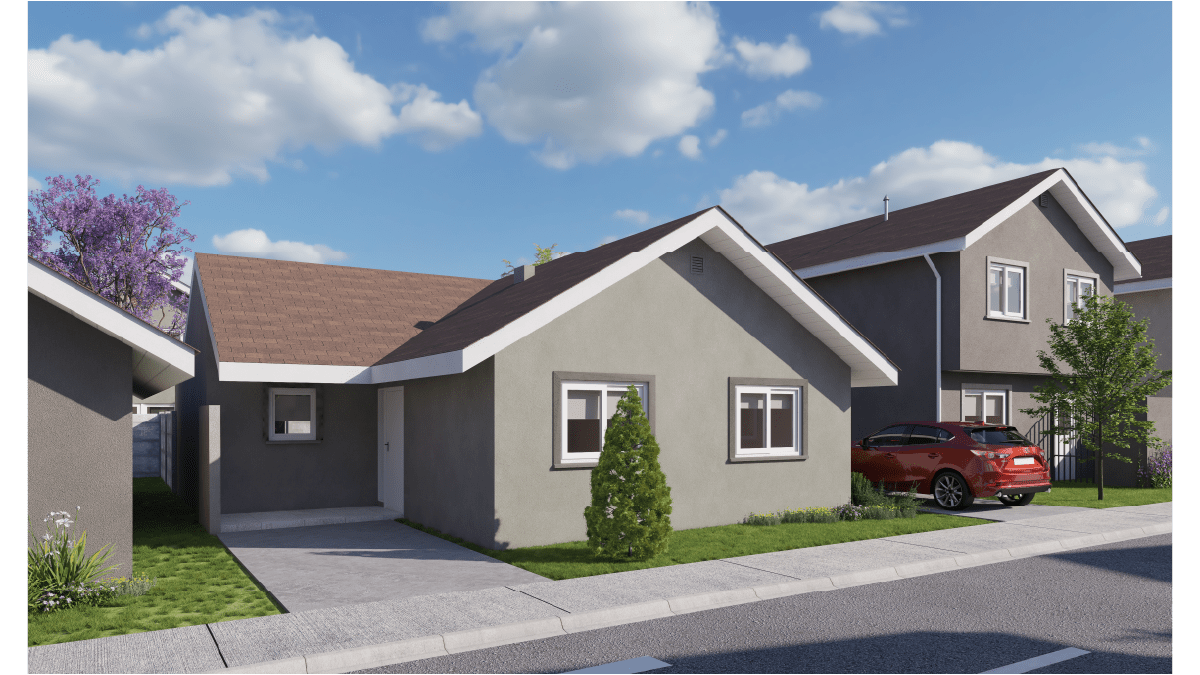 Características y terminaciones: casas sólidas primer y segundo piso, cocina amoblada con horno, campana y encimera. Ventanas de aluminio color titanio, vidrio simple.