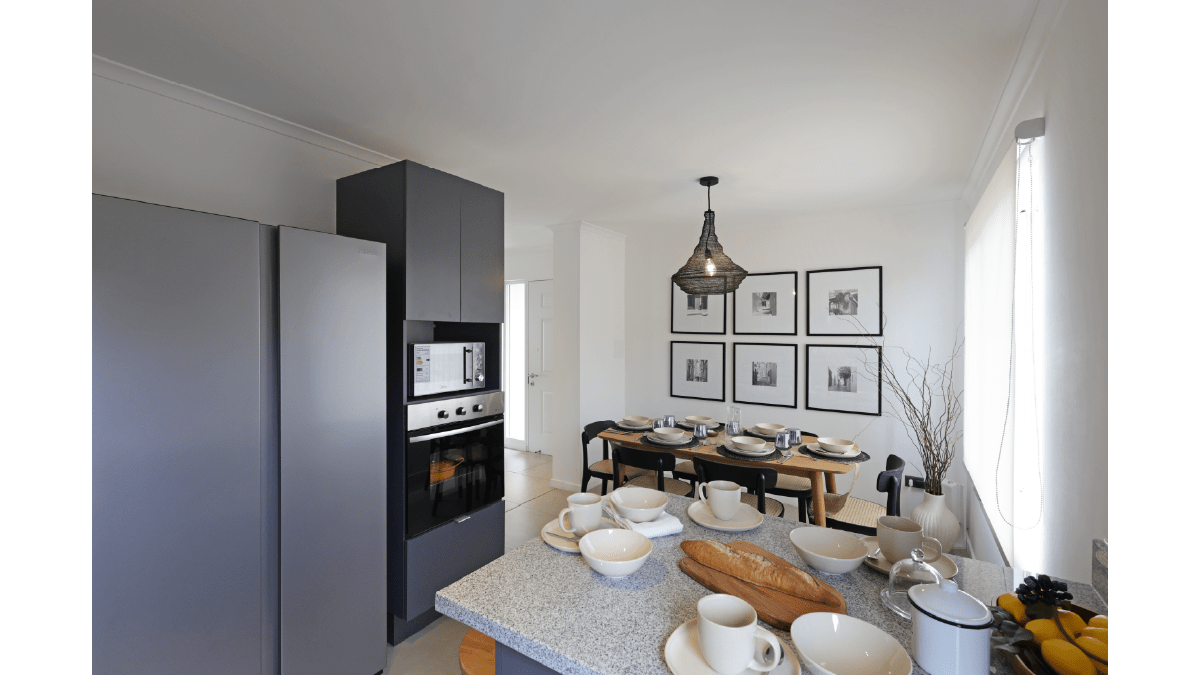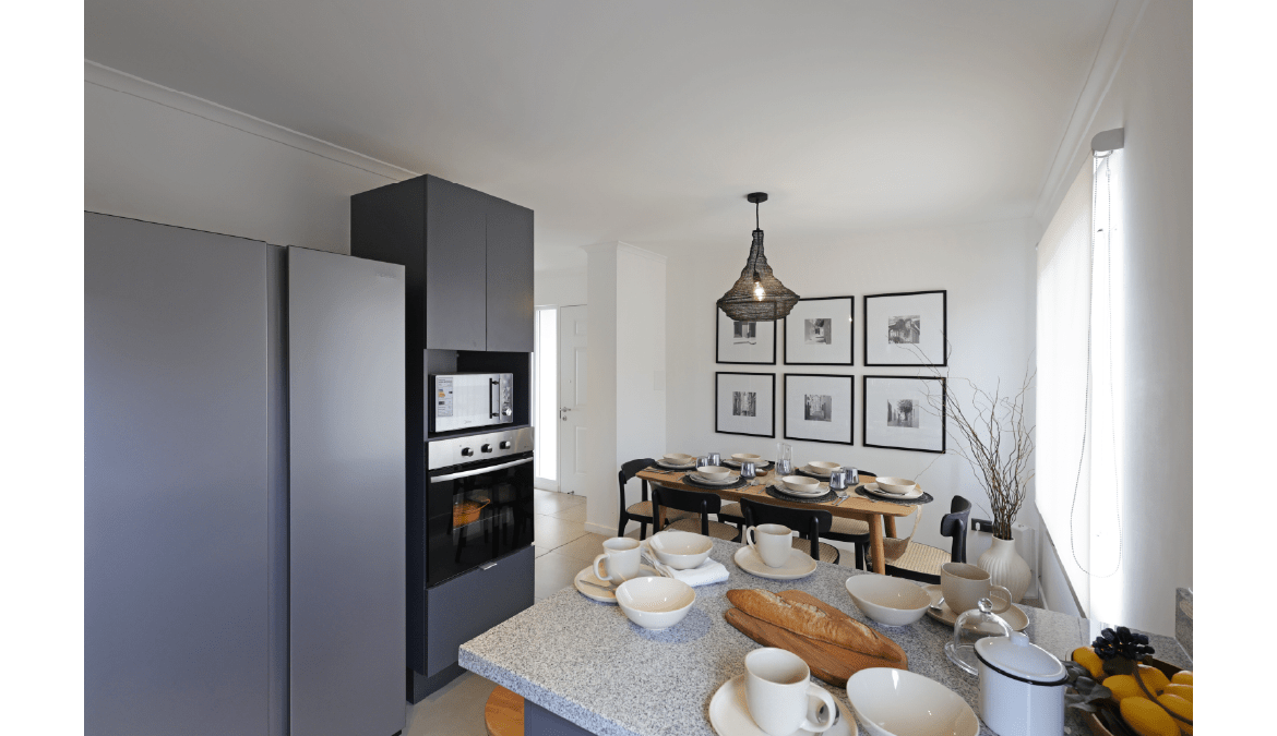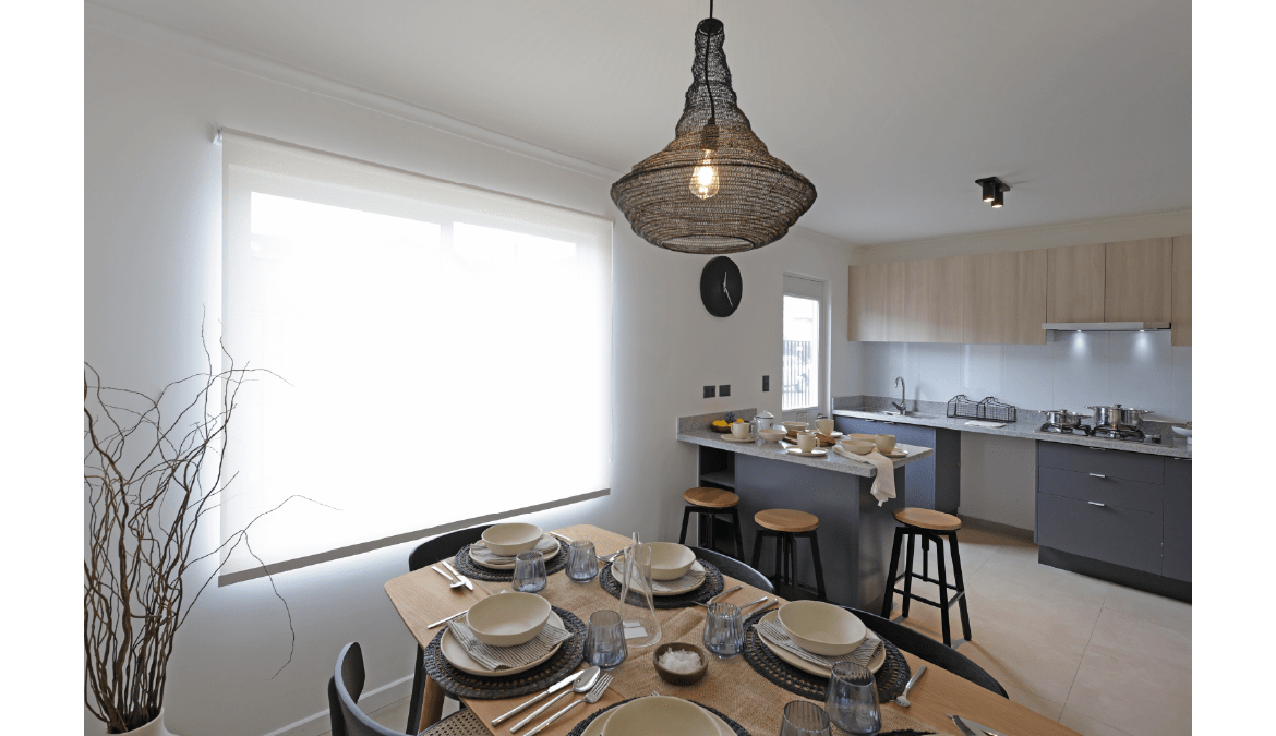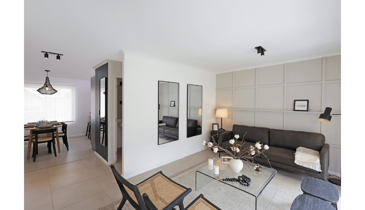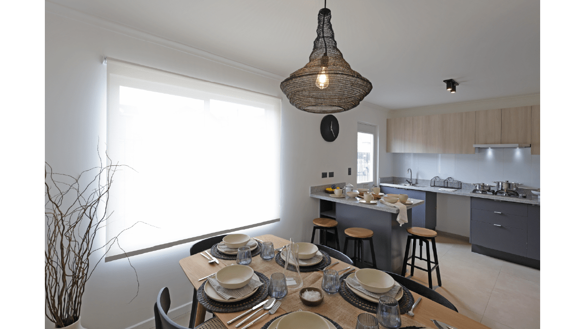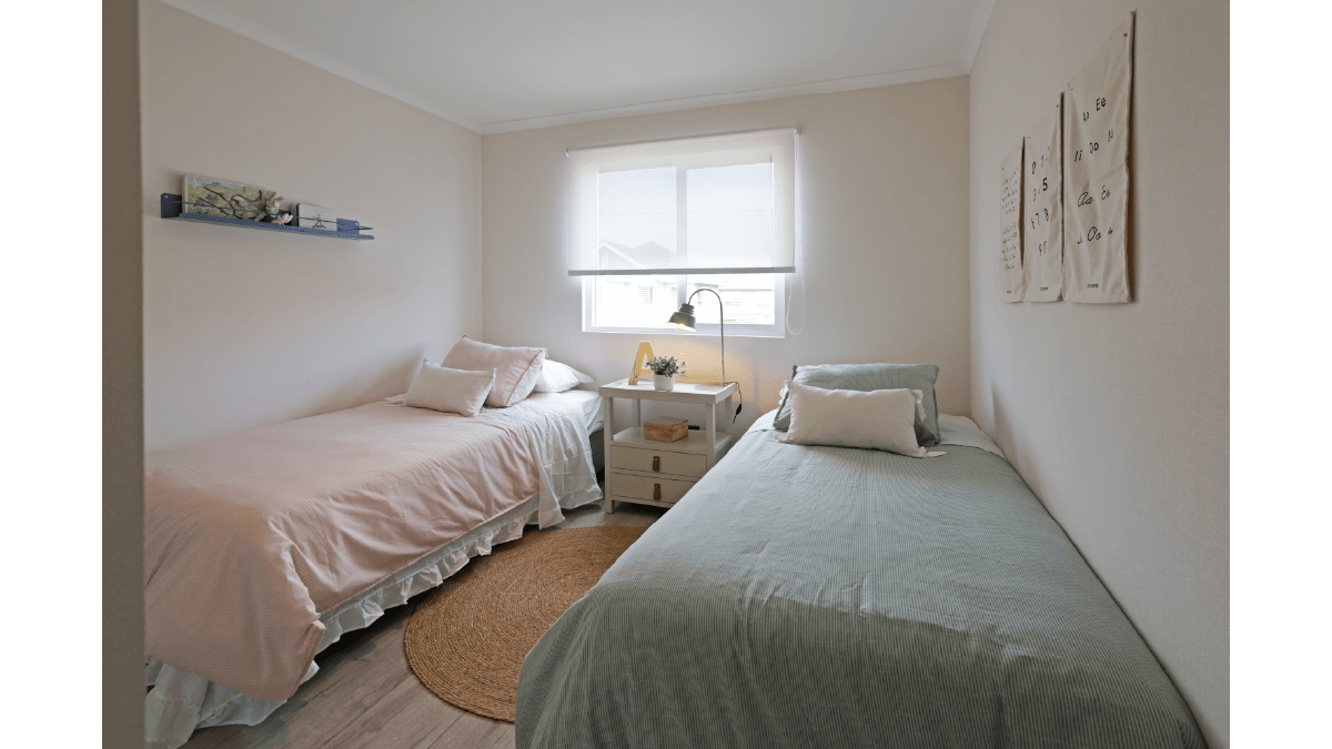 Características y terminaciones: casas sólidas primer y segundo piso, cocina amoblada con horno, campana y encimera. Ventanas de aluminio color titanio, vidrio simple.