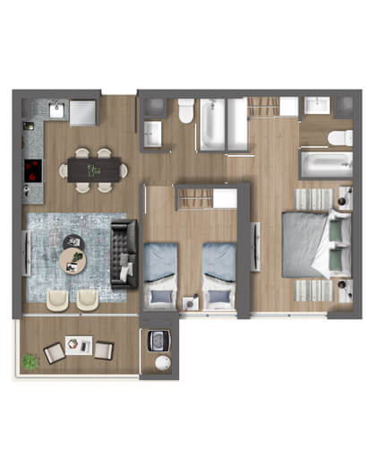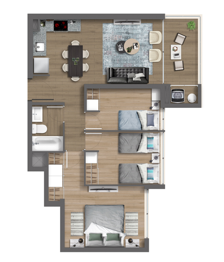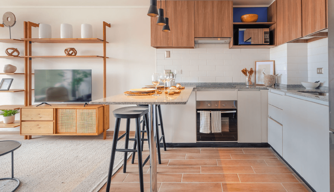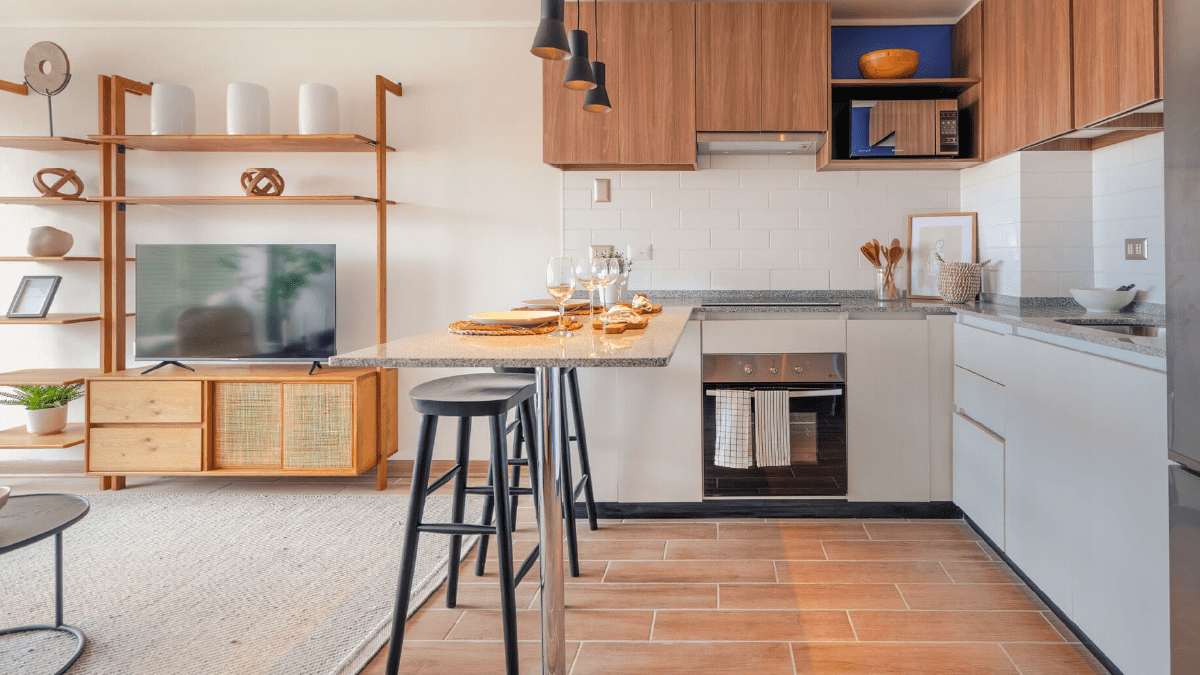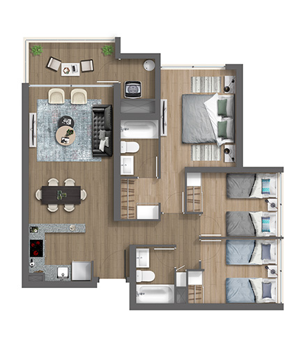 Características: Pisos de cerámica con folia madera en living, comedor, cocina y baños. Pisos fotolaminados en dormitorios. Horno, encimera y campana en cocina. Cubierta de granito en cocina.