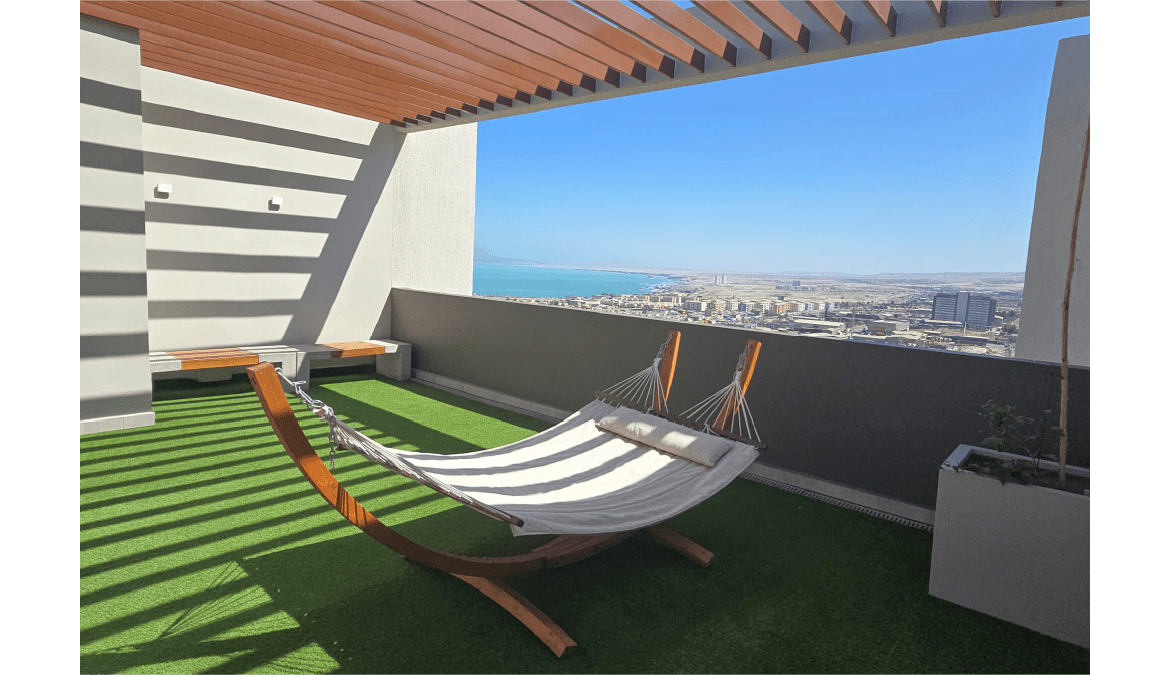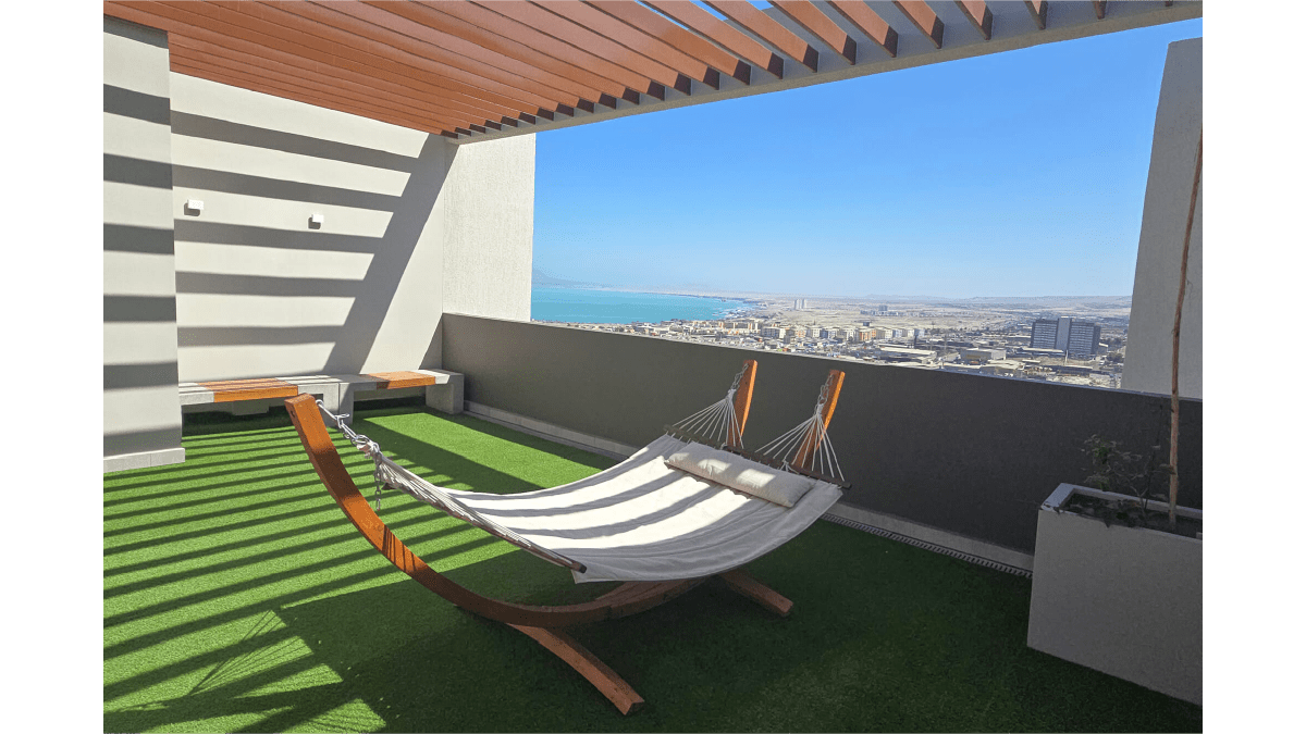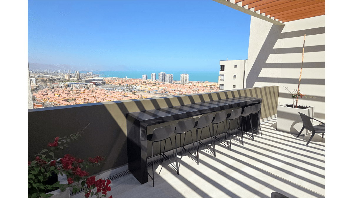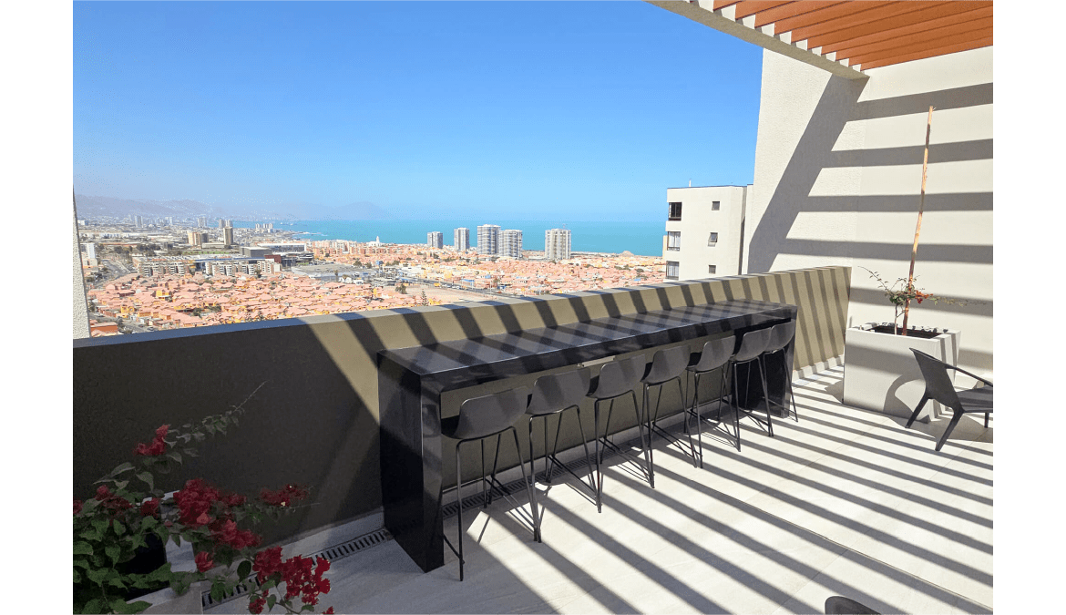 El edificio Las Garzas sobresale por el diseño de sus fachadas, con vigas que otorgan sombras a los espacios interiores y sostienen sus terrazas, dando una segunda piel al edificio y un look más contemporáneo. Sus quinchos con lounge integrados de doble altura conquistan la costa de toda la bahía de Antofagasta, con las puestas de sol más espectaculares de la ciudad.