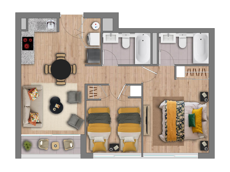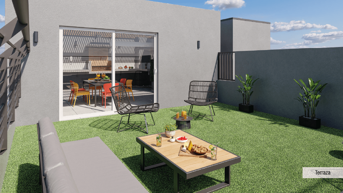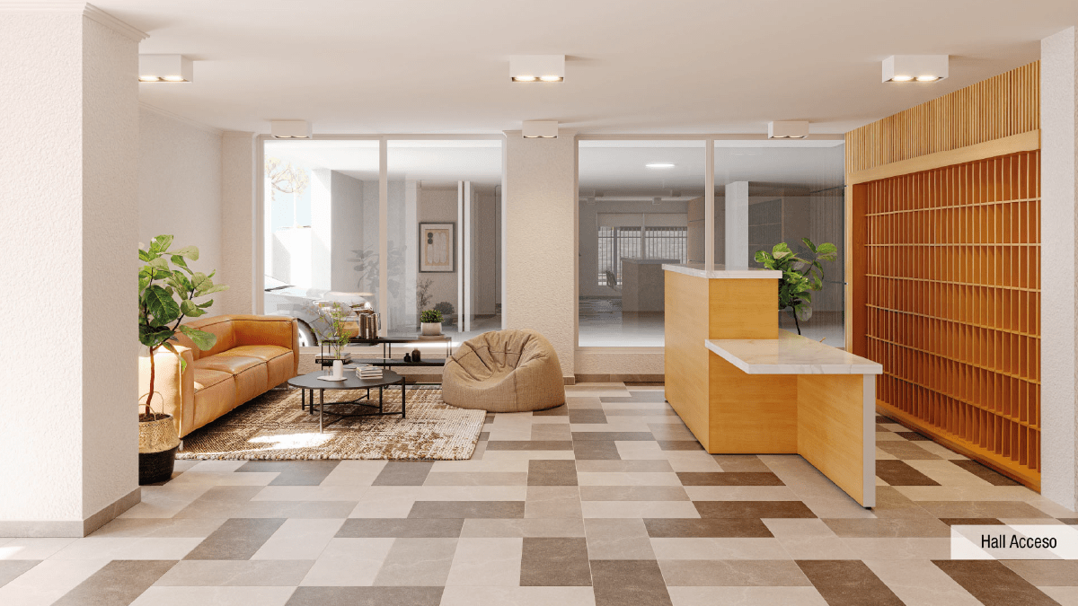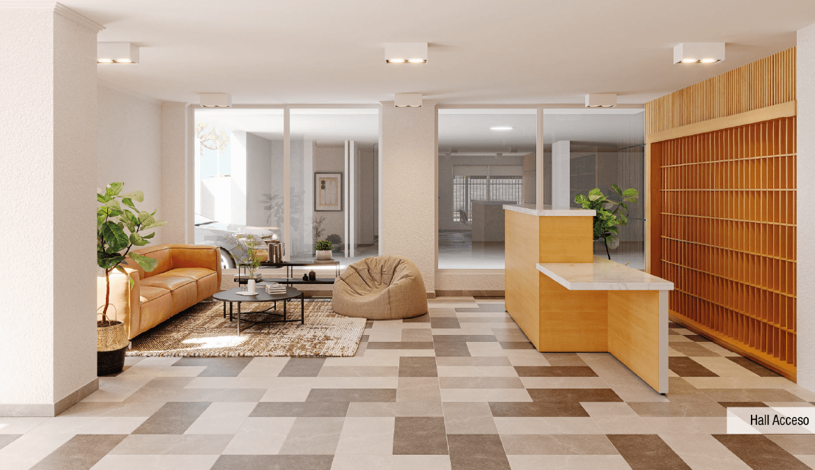 Características: Edificio Full Electric; Piso vinílico SPC en living comedor, pasillo y dormitorios; Piso gres porcelánico en terraza y baños; Cocina equipada con campana, horno eléctrico y encimera eléctrica; Cubierta de granito en muebles de cocina; Dormitorio principal en suite; Vanitorios en baños con mueble y cubierta de loza vítrea; Muros con papel mural; Ventanas con marco de PVC blanco; Espacio y conexión para lavadora en todos los departamentos; Termo eléctrico para agua caliente individual.