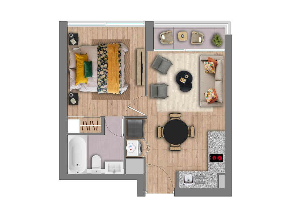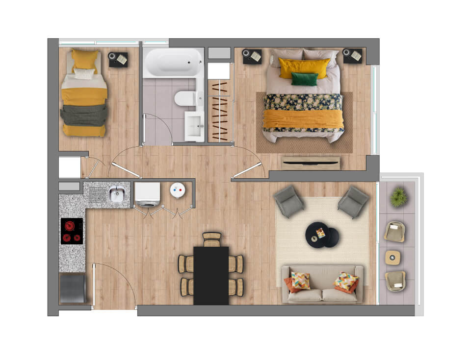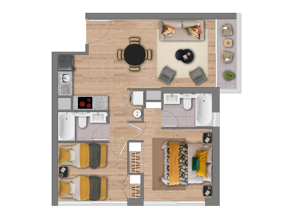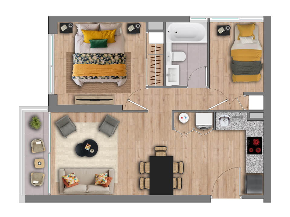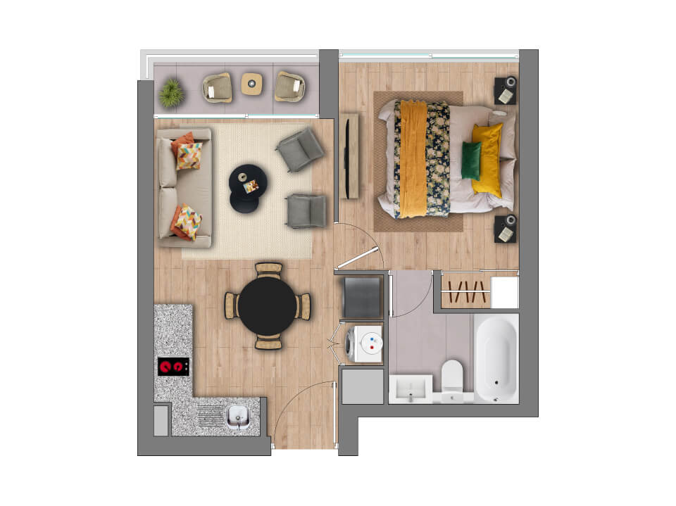 Características: Edificio Full Electric; Piso vinílico SPC en living comedor, pasillo y dormitorios; Piso gres porcelánico en terraza y baños; Cocina equipada con campana, horno eléctrico y encimera eléctrica; Cubierta de granito en muebles de cocina; Dormitorio principal en suite; Vanitorios en baños con mueble y cubierta de loza vítrea; Muros con papel mural; Ventanas con marco de PVC blanco; Espacio y conexión para lavadora en todos los departamentos; Termo eléctrico para agua caliente individual.